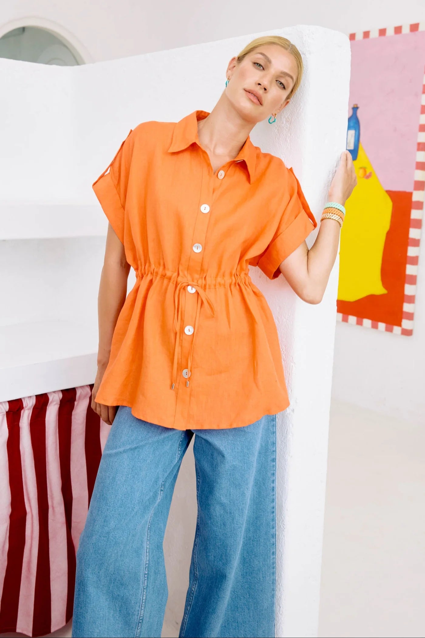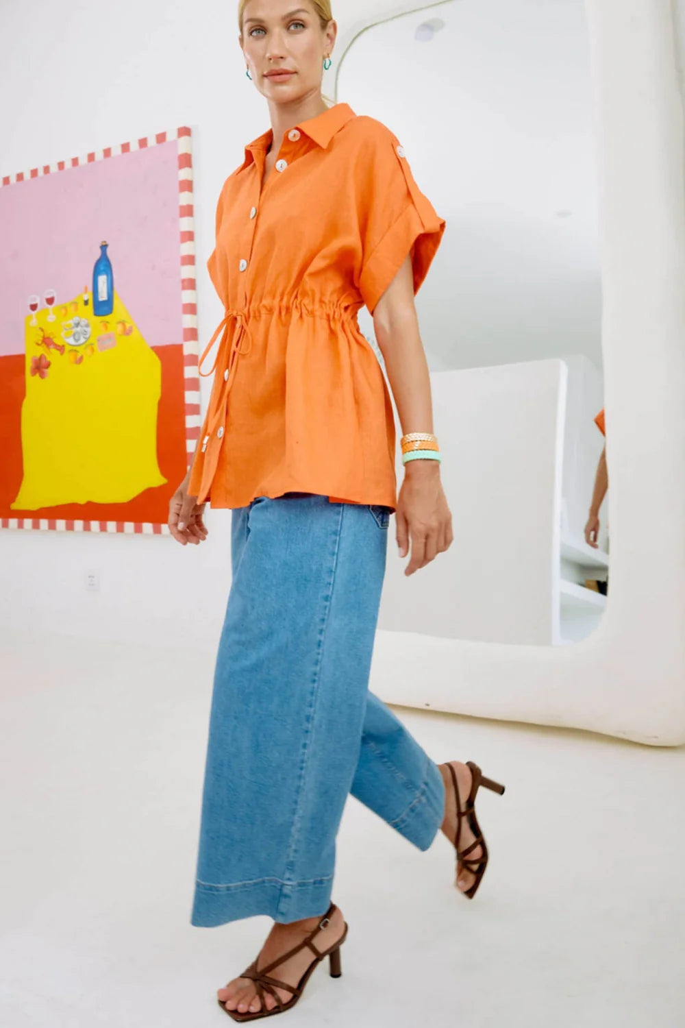 A slim A-line denim style for everyday wear. Crafted from cotton-rich stretch denim. Features a 7/8 length, fixed waist with belt loops, and wide cuff detail at the hem. Complete with contrast stitching and functional back pockets.