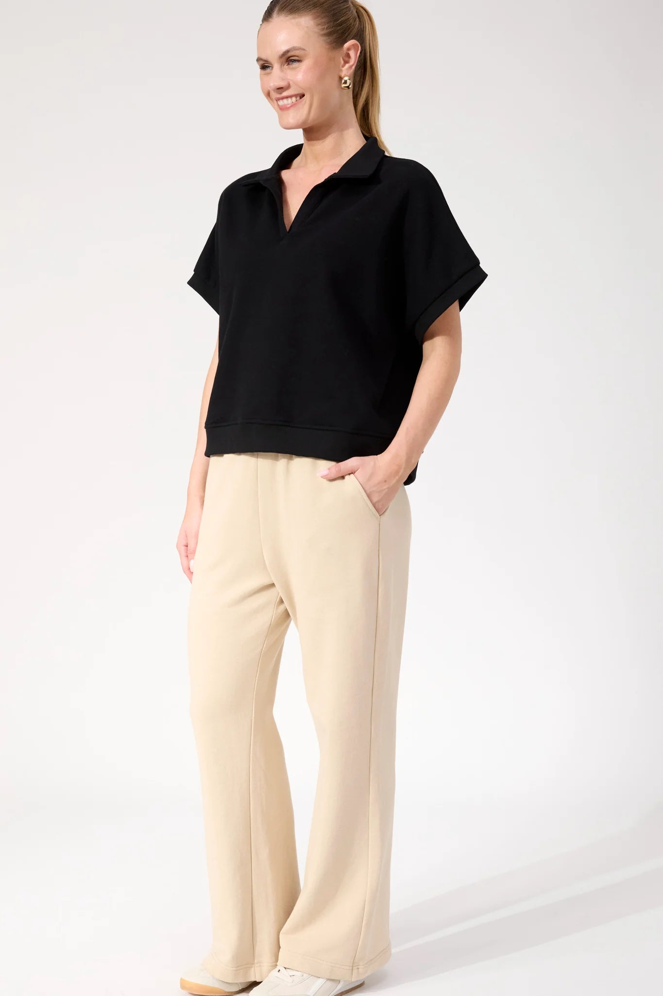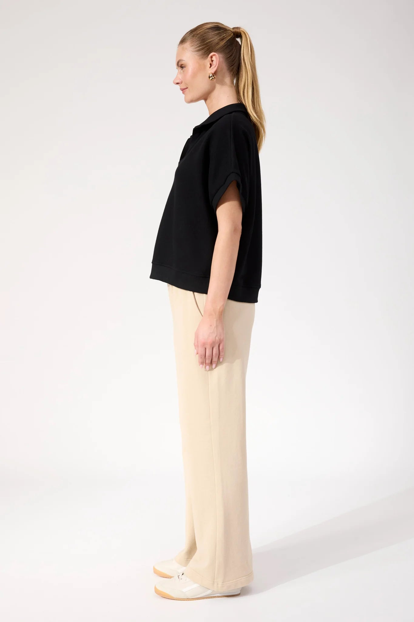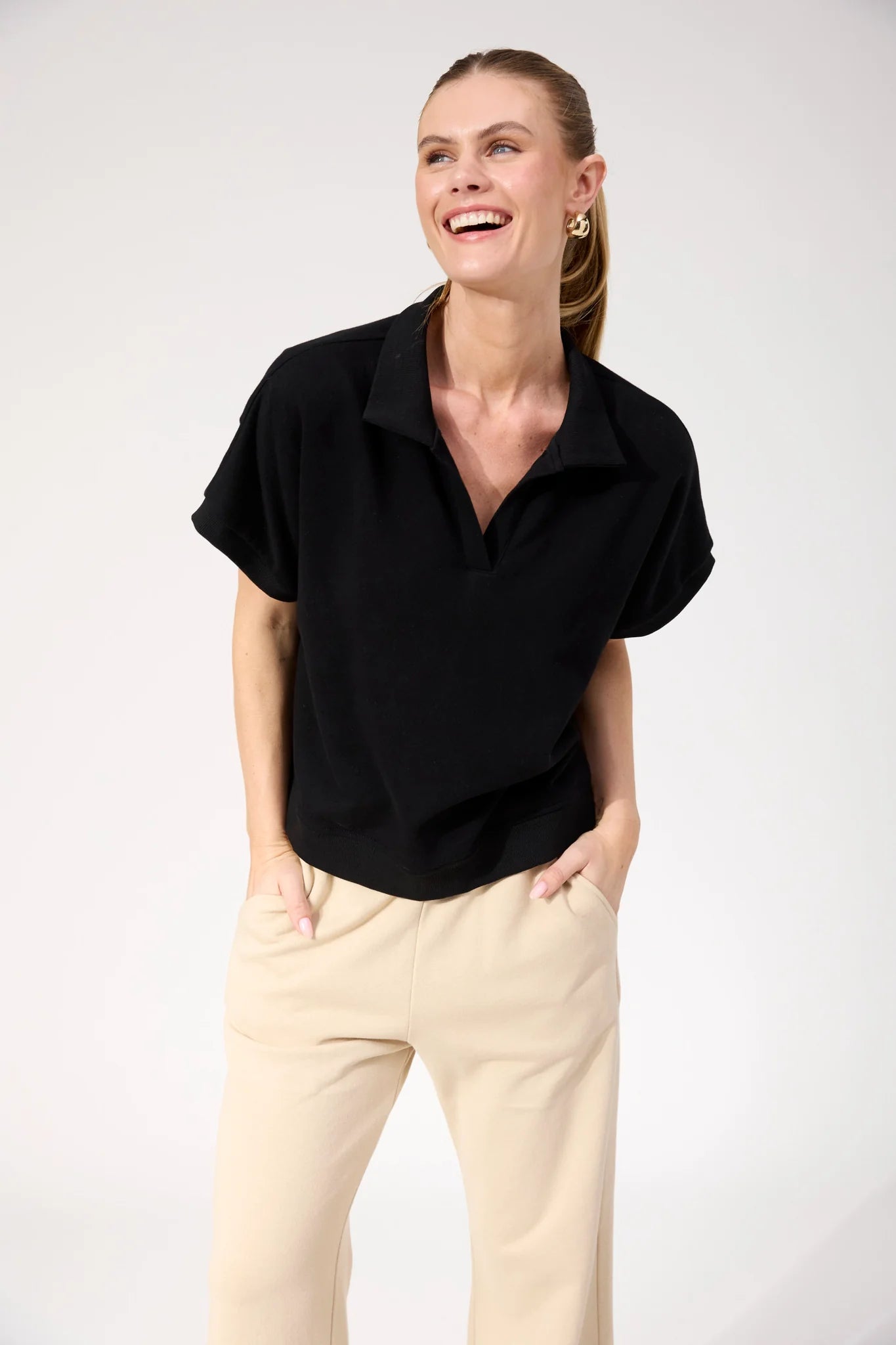A modern tee designed with sporty details. The Boston Crop Sweat Top features a relaxed collar with an open V-neckline and wide sleeves for an easy, off-duty feel. The slightly cropped length keeps it fresh and wearable across seasons.