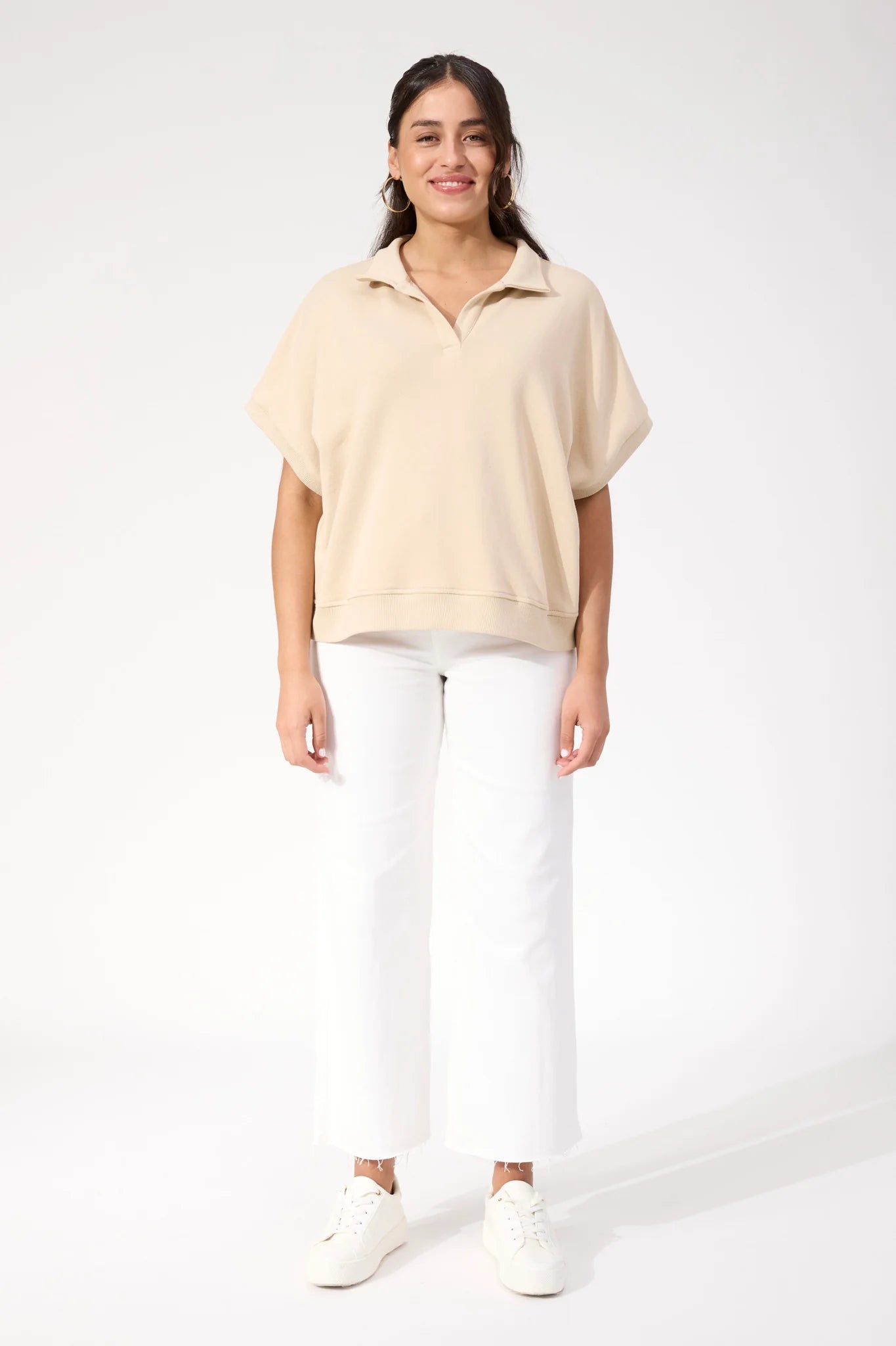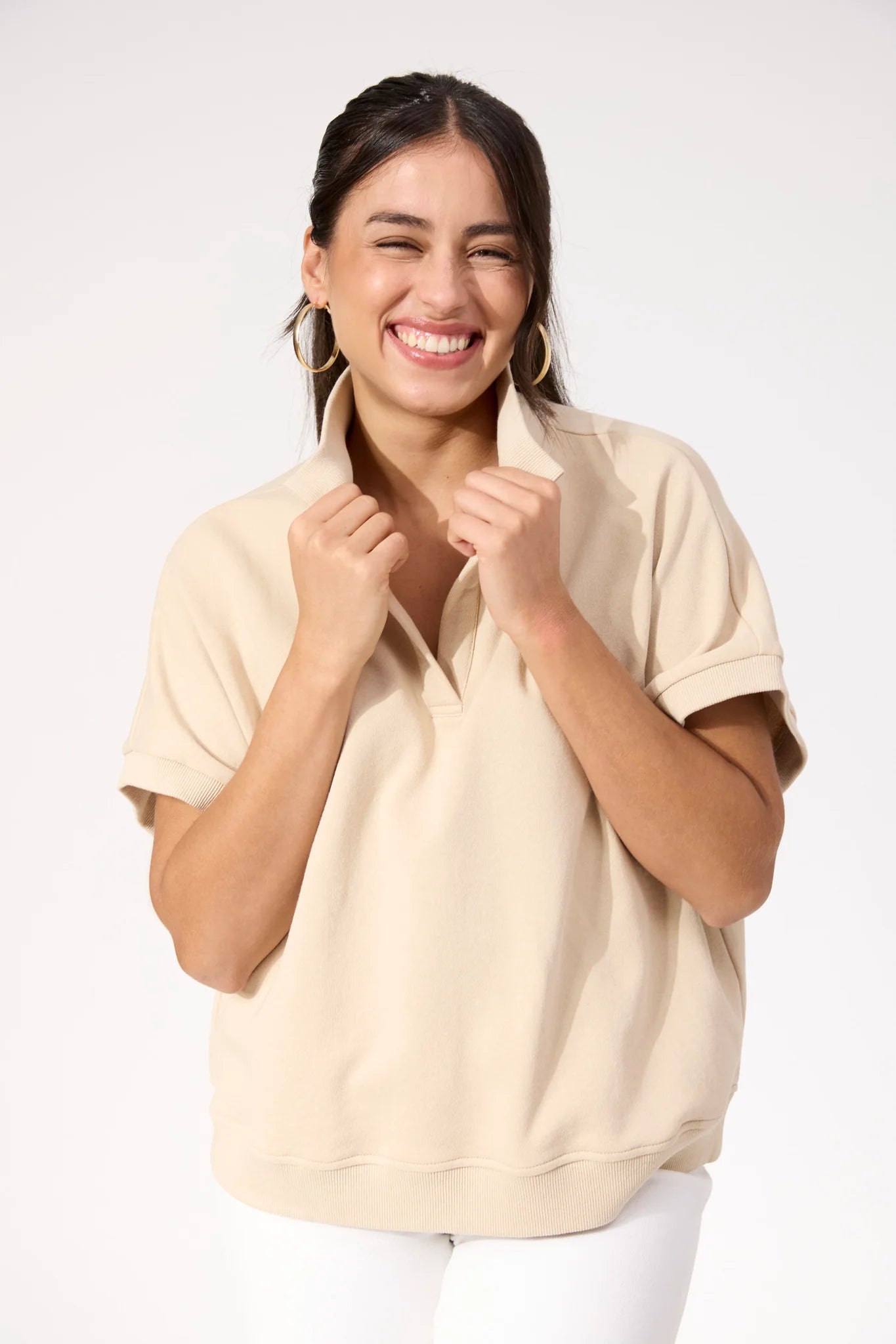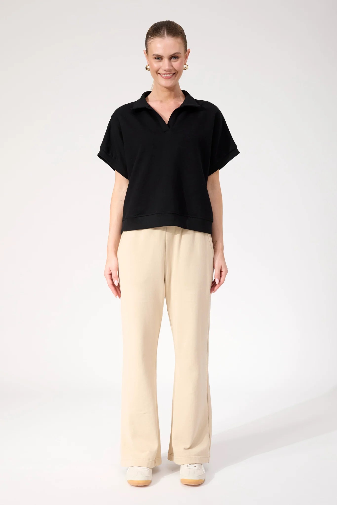 A modern tee designed with sporty details. The Boston Crop Sweat Top features a relaxed collar with an open V-neckline and wide sleeves for an easy, off-duty feel. The slightly cropped length keeps it fresh and wearable across seasons.