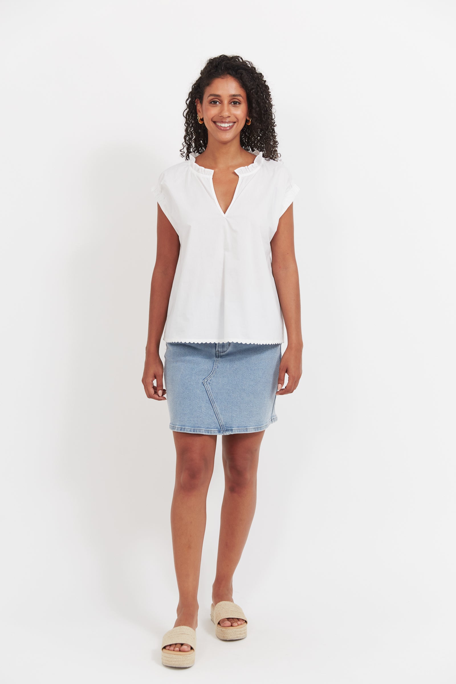 The Brasilia Top is a warm-weather staple. Featuring a soft V neckline with ruffle detailing, delicate ric-rac trim along the hem, and gently gathered shoulder panels that offer coverage while keeping things light. Cut in a relaxed fit that falls to the hip, it's made for effortless styling from day to night.