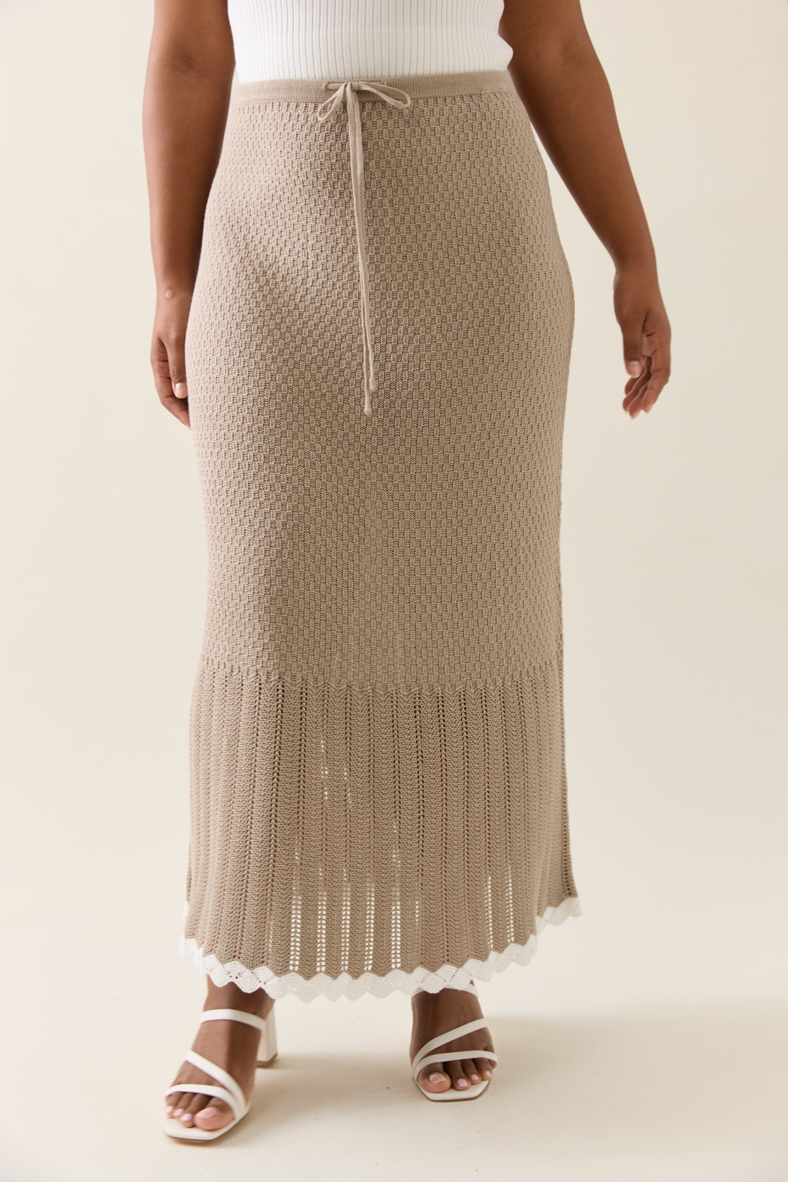 A breezy 7/8 length skirt made from 100% cotton in a pointelle knit texture. Designed with an elasticated waist and drawstring for ease and finished with scallop edge detailing at the hemline.