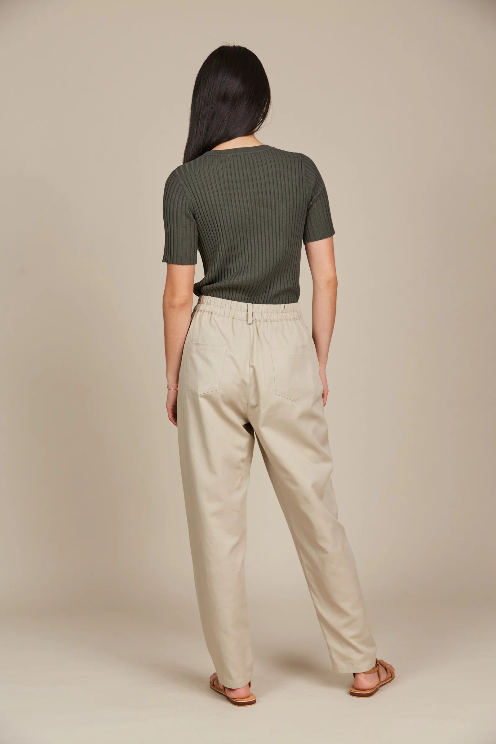 The Lucille Pant is set to become your new everyday favourite. In a linen and cotton blend, these pants are all about comfort. They feature a loose fit with a sleek, tapered ankle-length and a half-elastic waist that sits perfectly at your waist. The chic neutral palette makes these pants a versatile addition to your wardrobe, allowing you to mix and match effortlessly with your existing pieces.
