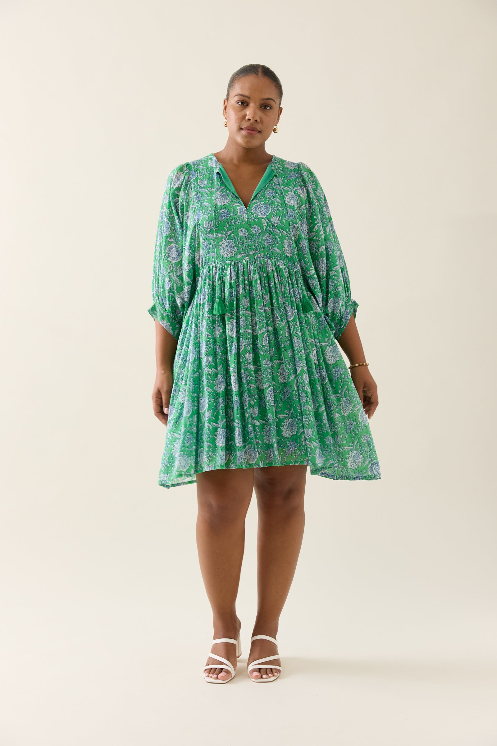 The Wilma Dress is crafted from lightweight cotton voile, hand screen printed for a one-of-a-kind look. Inspired by floral hand-block, and featuring a V-neckline with tassel ties, a gathered waist, 3/4 sleeves. Fully lined for comfort and ready to wear.