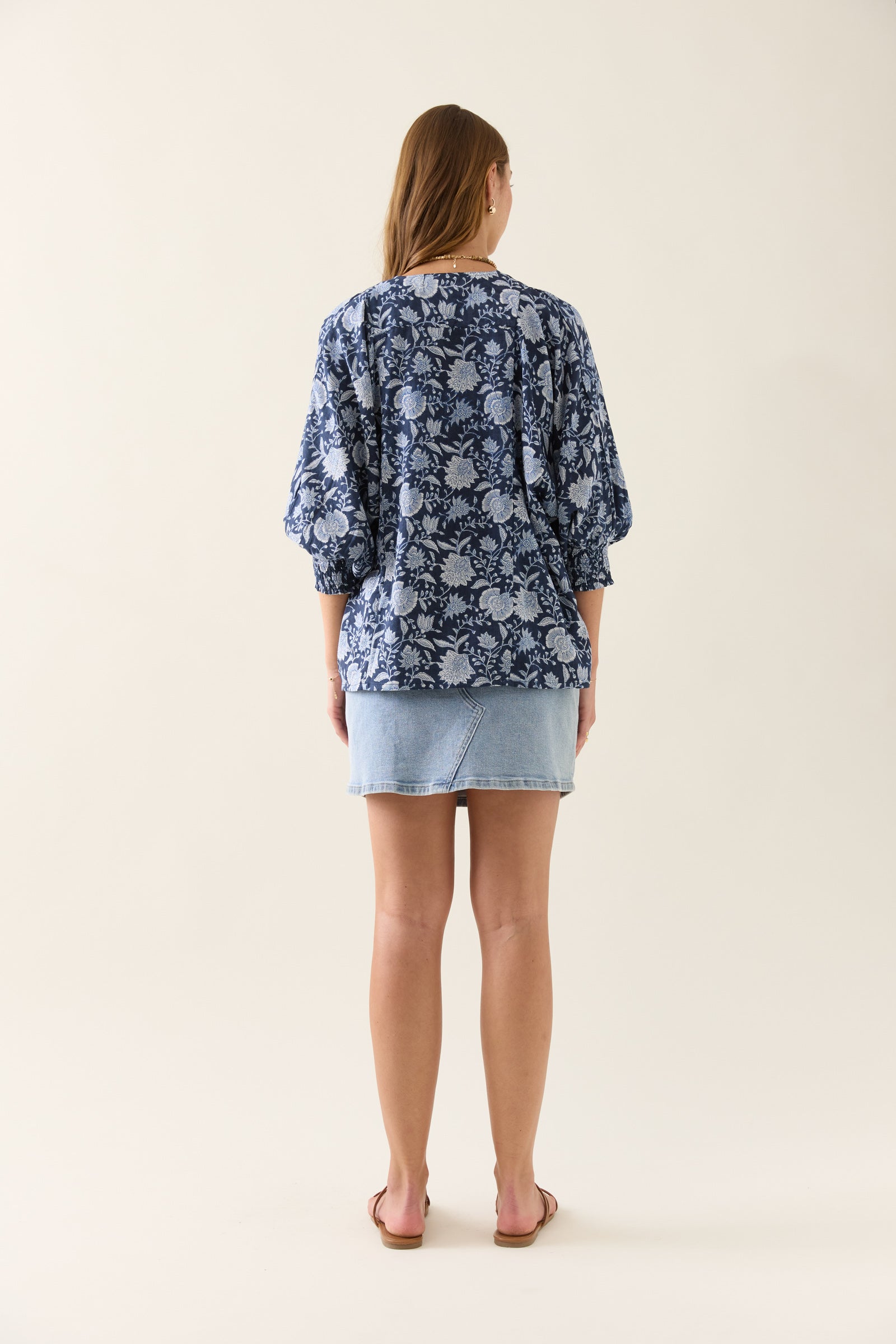 A colourful cotton voile piece with artisanal charm, inspired by floral hand-block. The Wilma Top is hand screen printed and features a soft front yoke, shirred 3/4 sleeves and a relaxed silhouette for everyday ease.