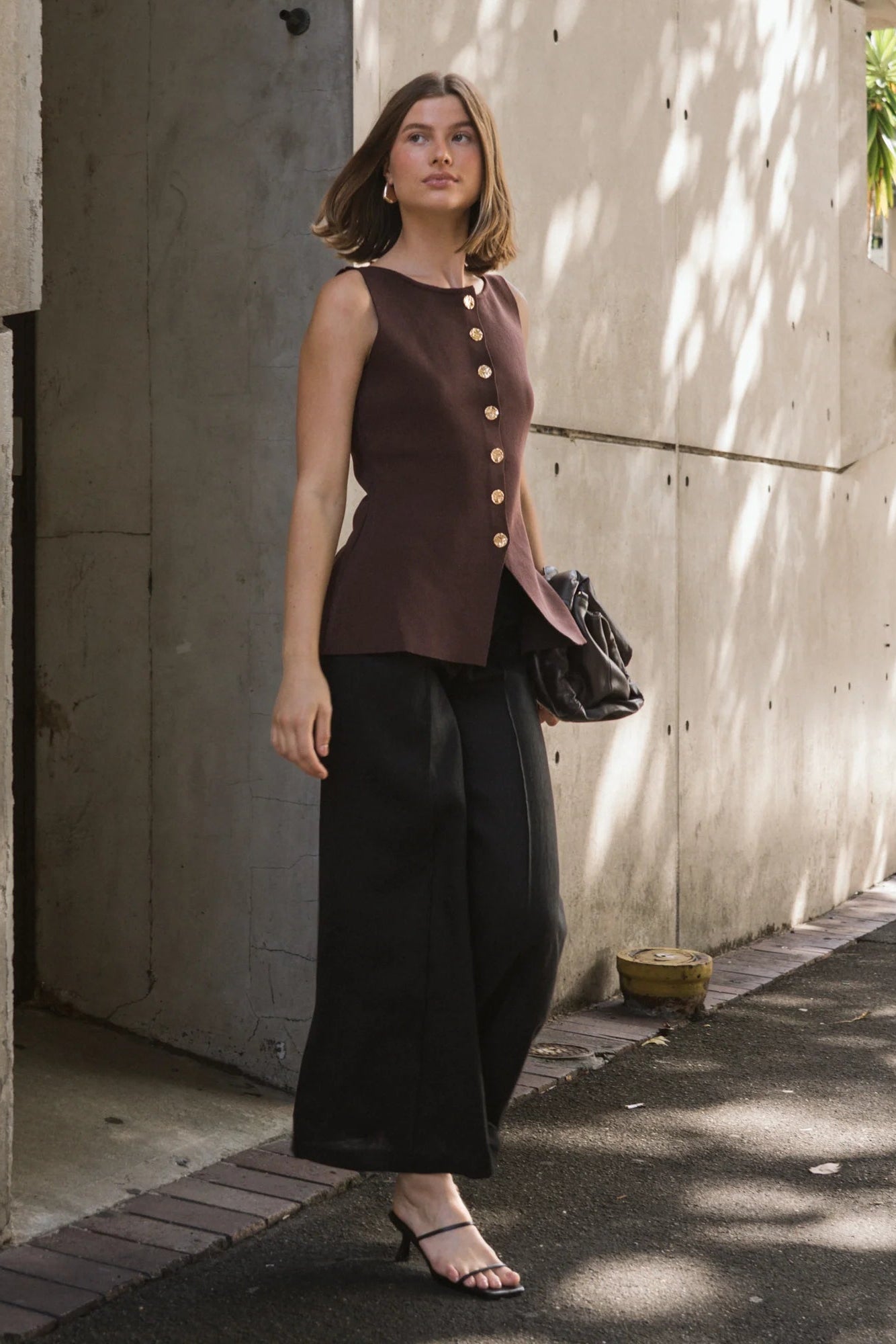 Work the wide leg look this season with Verano front seam pants in classic Black, the ultimate desk to dinner piece. Fabricated from 100% Linen, this high rise style features a flat waistband, front seam detailing, button/zip closure with a relaxed fit. Wear the Verano pants with a blouse and heels for day to night sophistication.